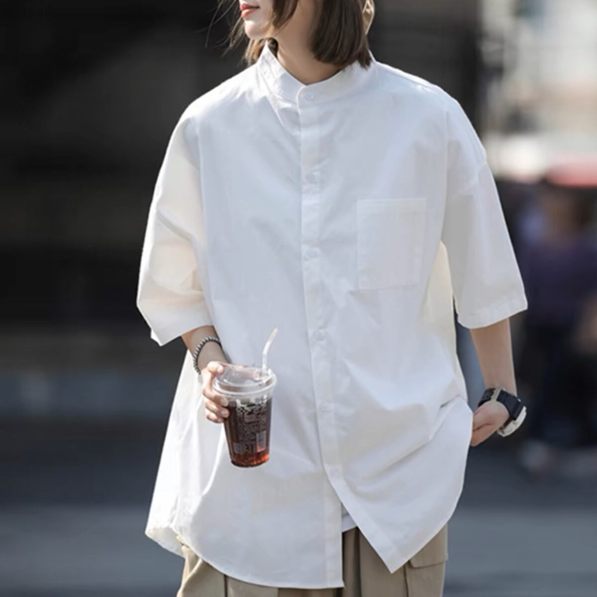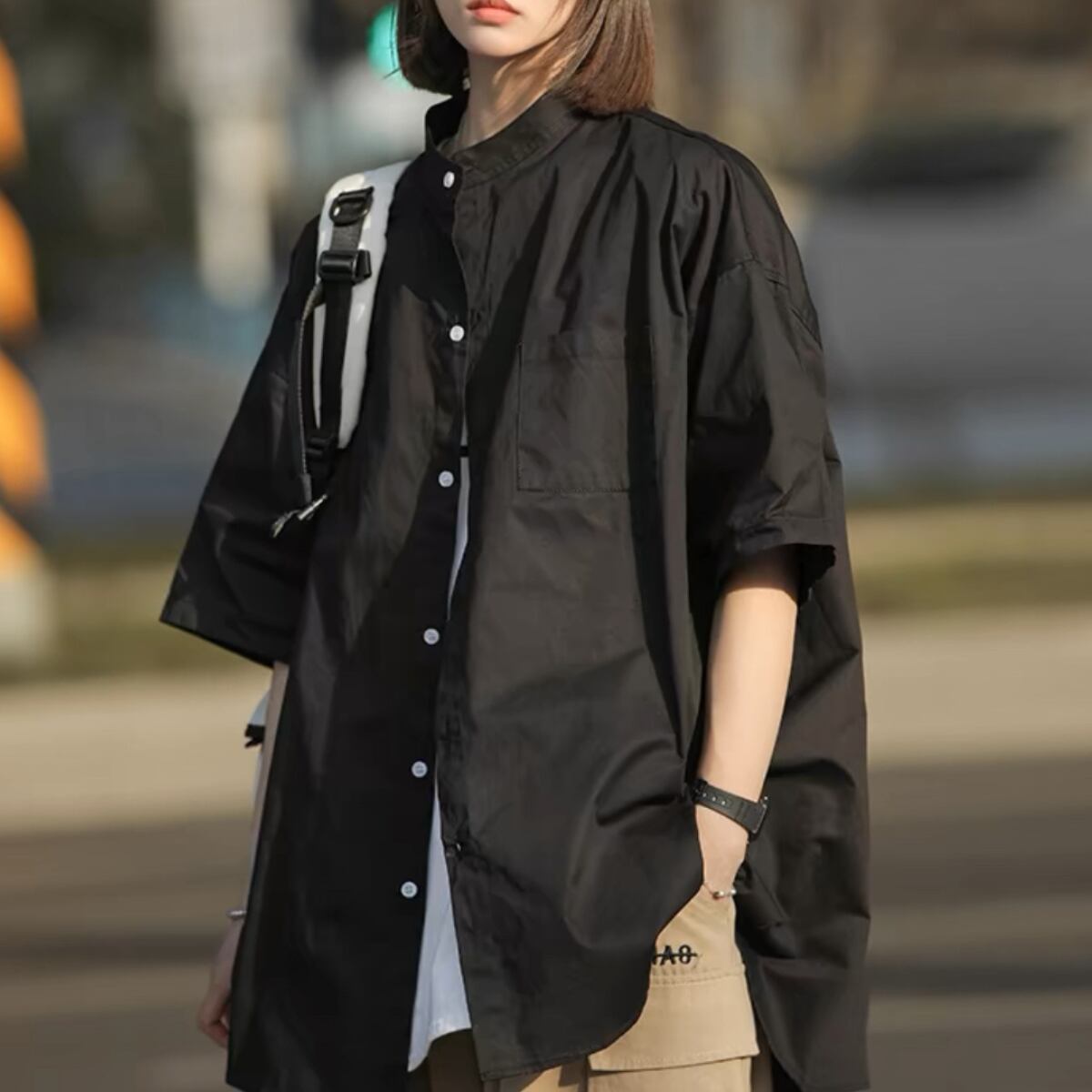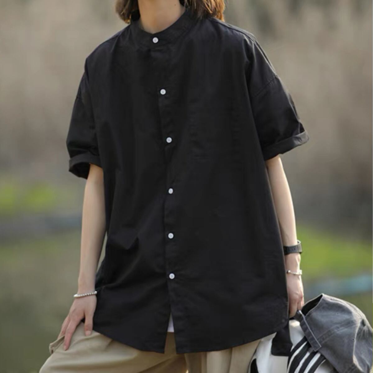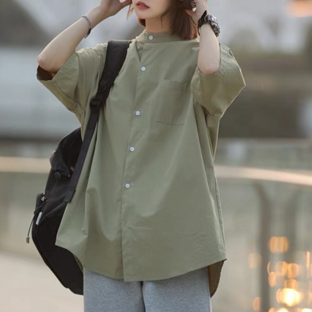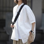 一枚でもアウターでも使えるラウンドネックシャツ